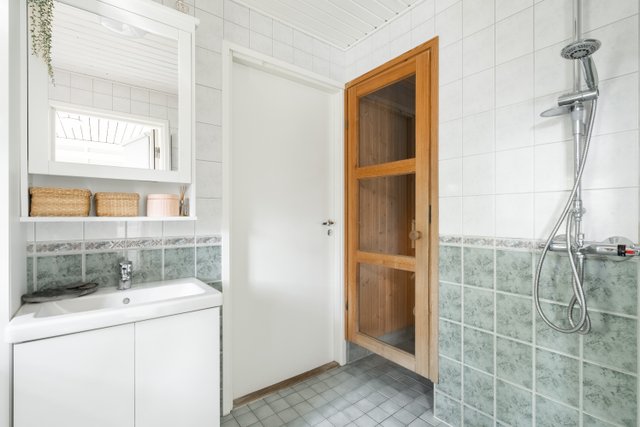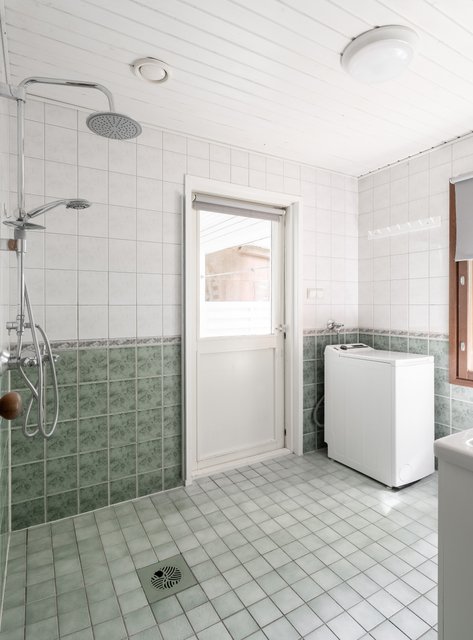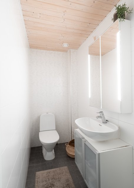 - Suihku, pesukoneliitäntä, peilikaappi, allaskaappi, pesuallas, ja lattialämmitys