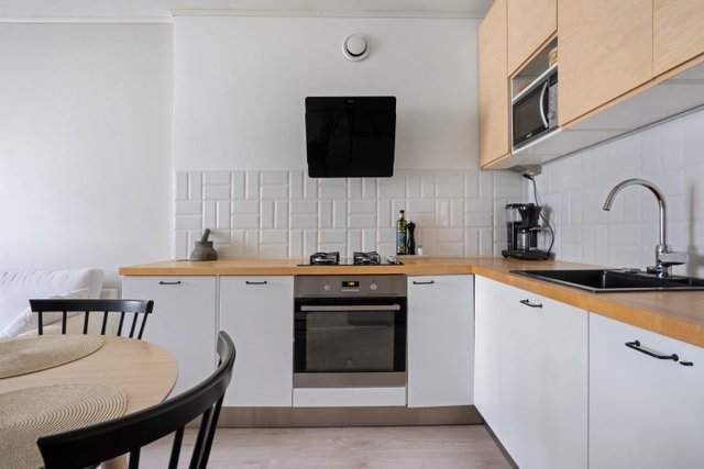 Keittiössä on kaikki tarvittavat mukavuudet aktiiviseenkin kokkailuun: kaasuliesi, runsaasti tasotilaa ja hyvin säilytystilaa. Siisti ja toimiva kylpyhuone, josta löytyy paikka pyykinpesukoneelle. Makuuhuoneessa ja eteisessä on reilusti kaappitilaa.
