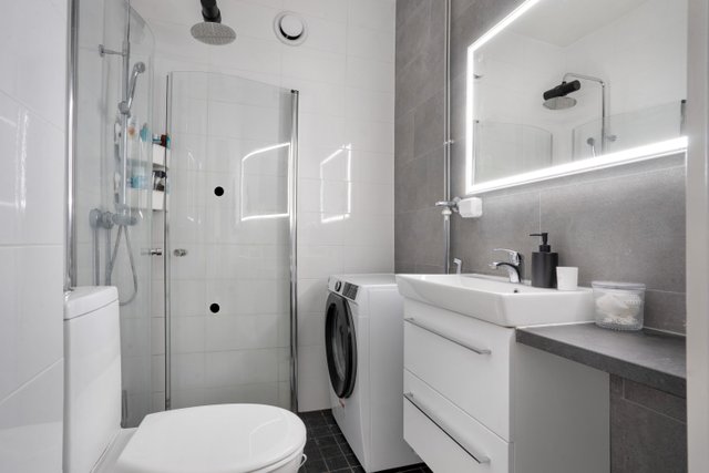 - WC-istuin, suihku, suihkuseinä, lattialämmitys, peili, pesuallas, allaskaappi, ja bidee-suihku