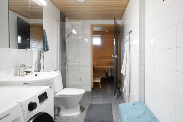 - WC-istuin, suihku, suihkuseinä, pesukoneliitäntä, lattialämmitys, peilikaappi, pesuallas, allaskaappi, ja bidee-suihku