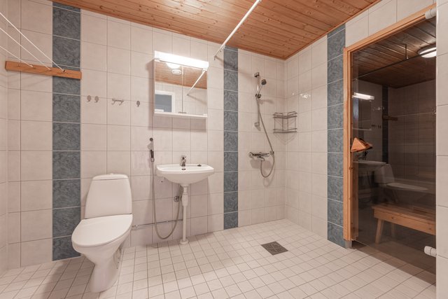 - WC-istuin, suihku, pesukoneliitäntä, lattialämmitys, peili, ja pesuallas