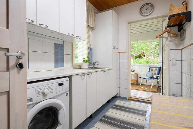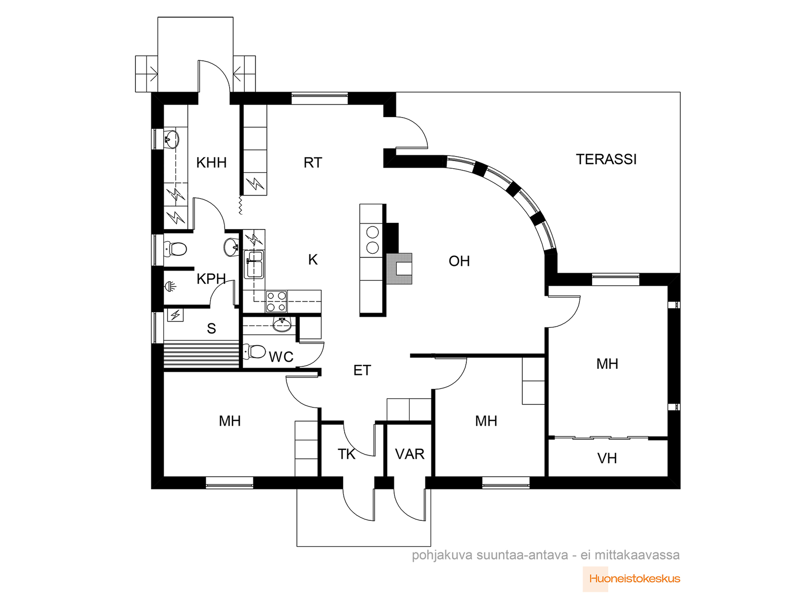 - Pyykkikaapit, lattialämmitys, pesuallas, pöytätaso, pesukoneliitäntä, ja lattiakaivo