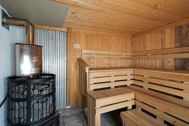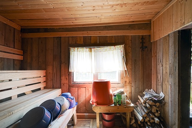 Pihassa erillinen saunarakennus, jonka lauteet ja kiuas uusittu.