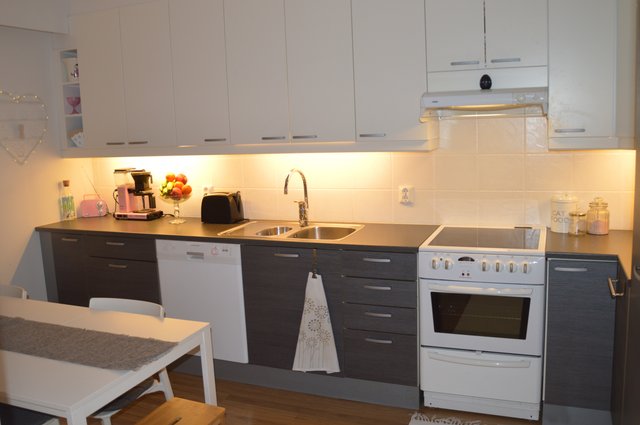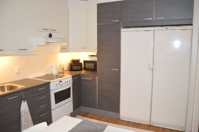 - Jääkaappi, erillinen pakastin, liesituuletin, astianpesukone, liesi, ja uuni