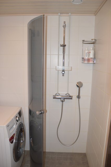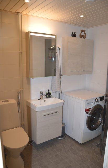 - WC-istuin, suihku, suihkuseinä, lattialämmitys, pesukoneliitäntä, peilikaappi, allaskaappi, ja bidee-suihku