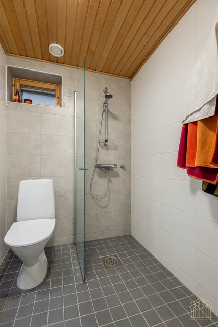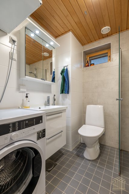 - WC-istuin, suihkuseinä, suihku, pesukoneliitäntä, lattialämmitys, peilikaappi, bidee-suihku, allaskaappi, ja pesuallas