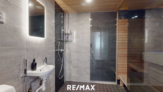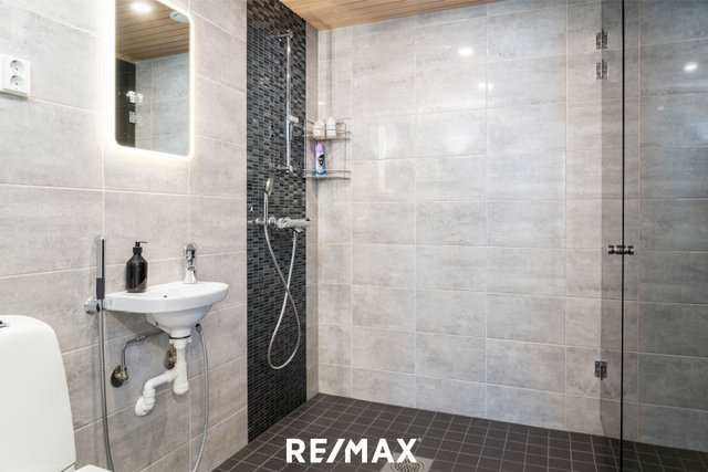 - WC-istuin, suihku, lattialämmitys, peili, pesuallas, ja bidee-suihku