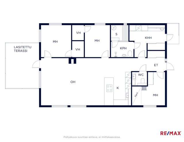- Jääkaappi, erillinen pakastin, mikroaaltouuni, liesituuletin, liesi, astianpesukone, keittiösaareke, ja erillisuuni