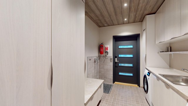 - Pesukone, kuivausrumpu, lattiakaivo, lattialämmitys, pesuallas, kurapiste, ja pöytätaso