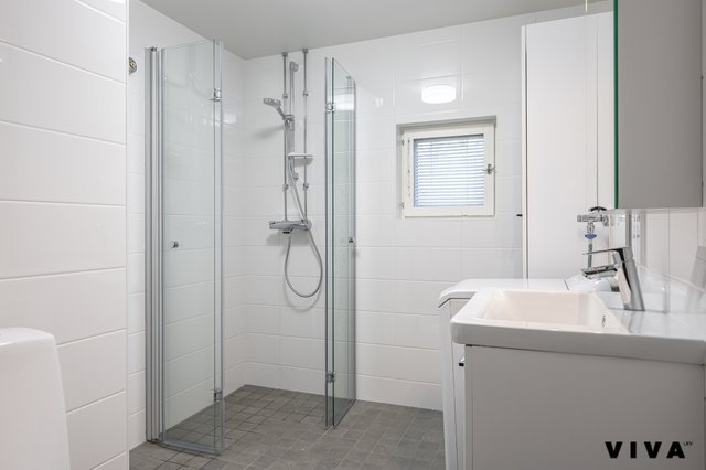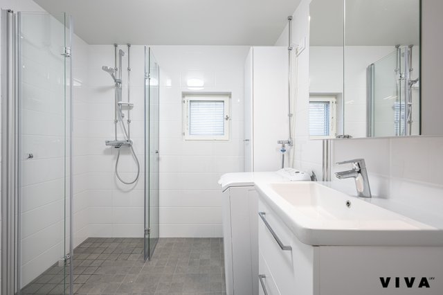 - WC-istuin, suihku, suihkuseinä, pesukoneliitäntä, pesuallas, allaskaappi, peilikaappi, ja pyykkikaappi