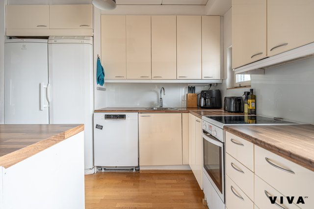 Tässä keittiössä on kunnolla laskutilaa, hyvä työskentelykorkeus ja kaappeja niin, ettei tarvitse tunkea kattiloita tetris-muodossa.