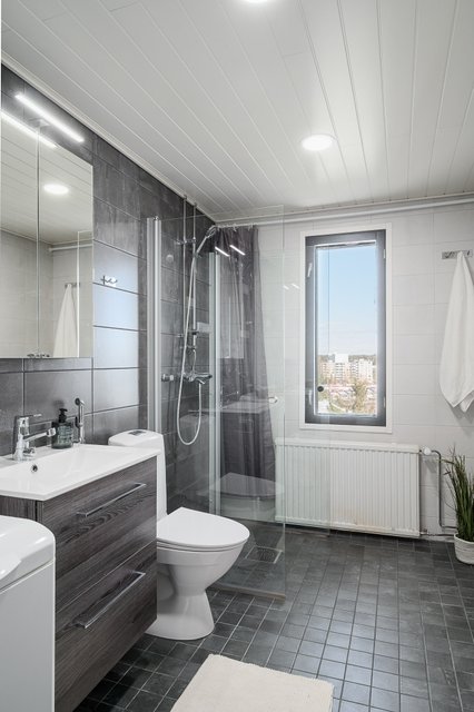 - Pesukoneliitäntä, peilikaappi, suihku, suihkuseinä, wc-istuin, lattialämmitys, ja pesuallas