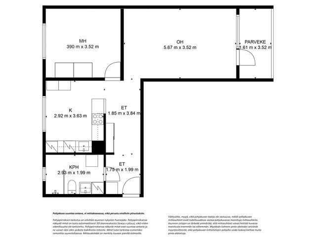 - Yhtiöjärjestyksen mukainen, Isännöitsijäntodistuksen mukainen, (Pinta-ala ei ole tarkistusmitattu ja todellinen pinta-ala voi olla suurempi tai pienempi, kuin ilmoitettu)