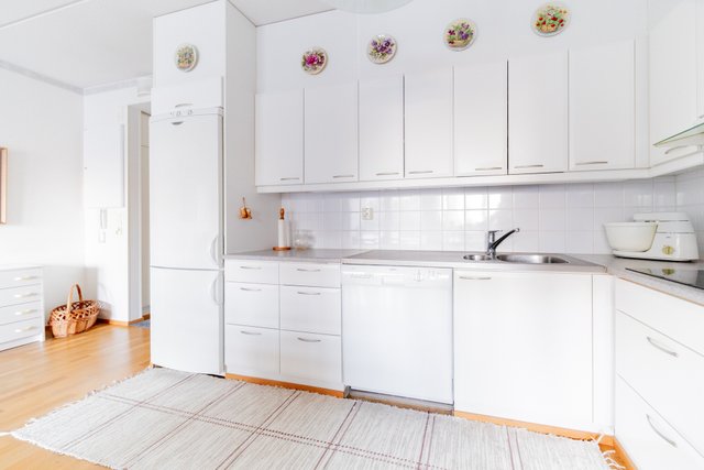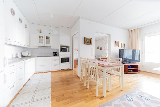 - Vaaleat kalusteet, hyvin säilytystilaa ja työtasoa. Työtason korkeus 85cm ja yläkaapit madallettu. Erilliuuni ja mikrotaso selkäystävällisellä käyttökorkeudella.