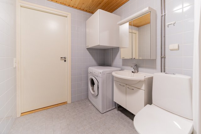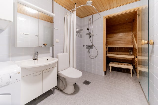 - WC-istuin, suihku, pesuallas, peilikaappi, allaskaappi, lattialämmitys (Kaukolämmöllä), ja pesukoneliitäntä
