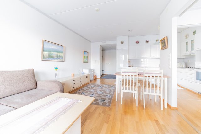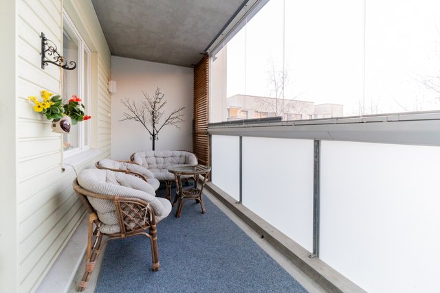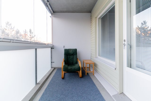 Keittiö tarjoaa runsaasti säilytystilaa ja kattavan kodinkoneistuksen. Makuuhuoneen yhteydessä on tilava vaatehuone, joka helpottaa arjen säilytysjärjestelyjä. Kylpyhuoneessa on paikka pyykinpesukoneelle sekä oma sauna. Lisätilaa löytyy koko huoneiston levyiseltä lasitetulta parvekkeelta, jolta avautuvat kauniit puistomaiset näkymät ilta-aurinkoon.