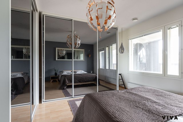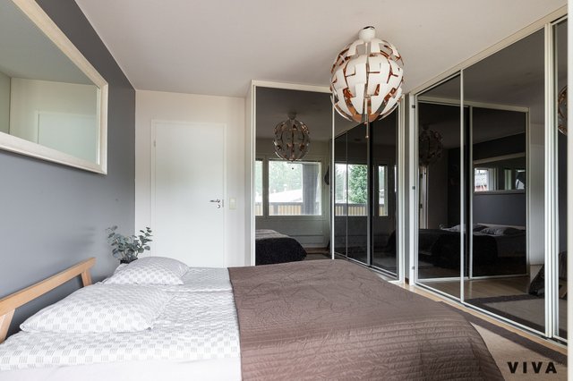 - Paljon säilytystilaa liukuovikaapeissa. Yläkerran ison makuuhuoneen toinen liukuovikaappi on mahdollista palauttaa takaisin alakerran makuuhuoneeseen.