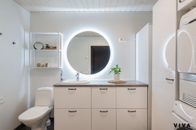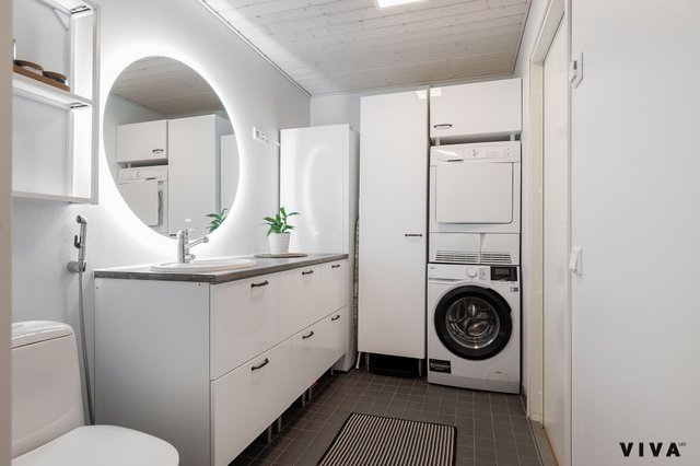 - Lattialämmitys, pyykkikaapit, pöytätaso (Paljon säilytystilaa), ja tila pesutornille