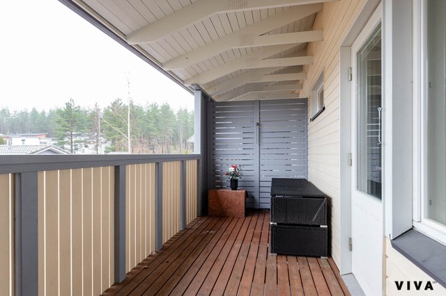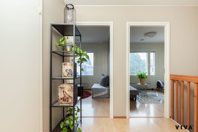 Säilytystilaa on poikkeuksellisen runsaasti ja se riittää myös isomman perheen tarpeisiin. Alakerrasta löytyy monikäyttöinen makuuhuone, joka sopii loistavasti vanhempien rauhalliseksi keitaaksi, vierashuoneeksi tai työtilaksi. Yläkerrassa on kolme makuuhuonetta ja tilava parveke, jossa on mukava nauttia aamukahvit tai rauhoittua viimeiseksi illalla.