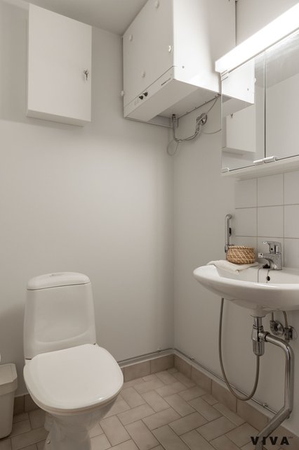 - WC-istuin, suihku, pesukoneliitäntä, peilikaappi, ja allaskaappi