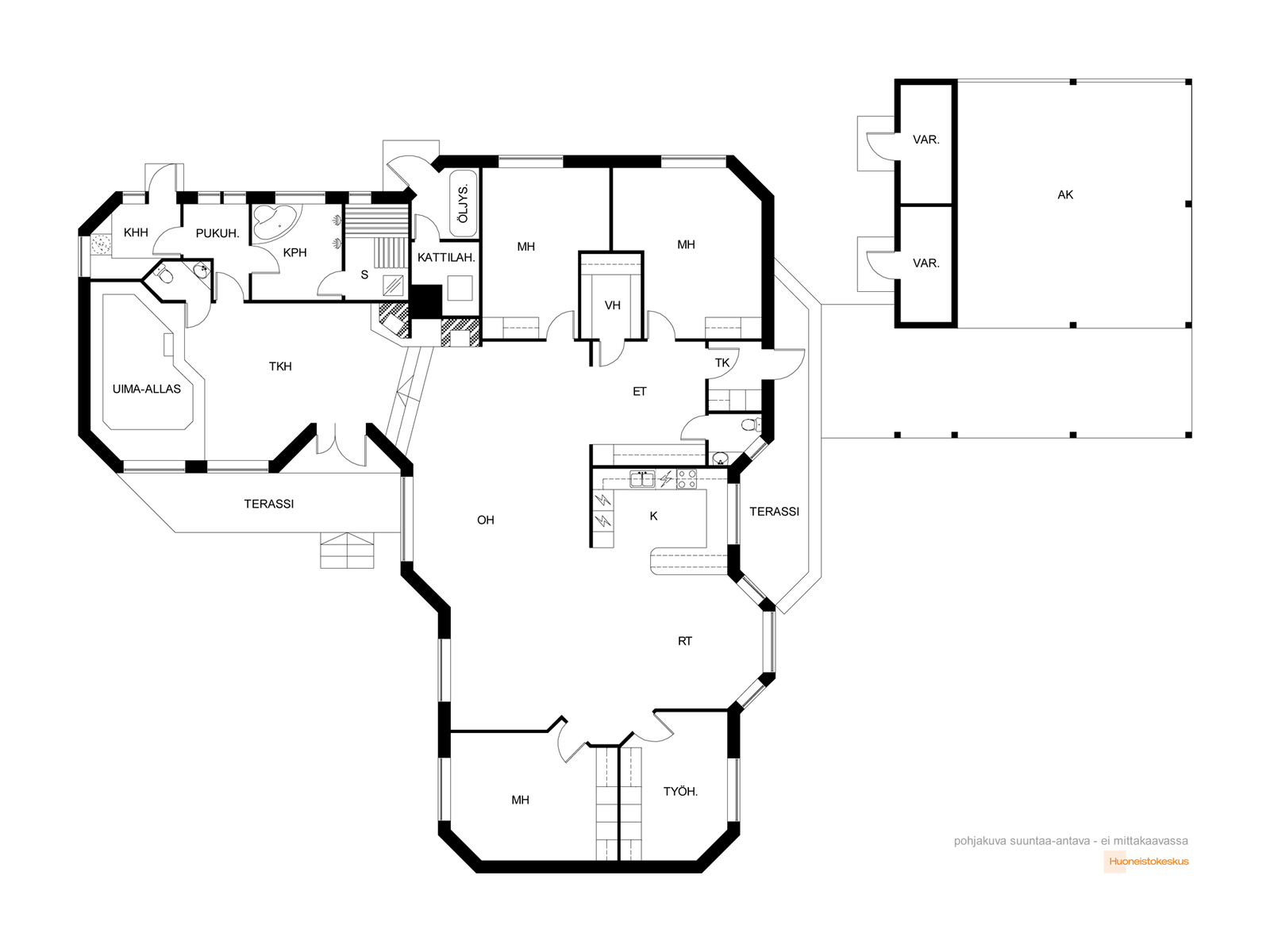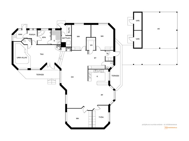 - Lattiat pääsääntöisesti tammiparkettia, märkätilat laatoitetut, kuten myös avoin takkahuone jossa uima-allas.