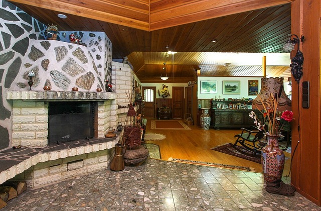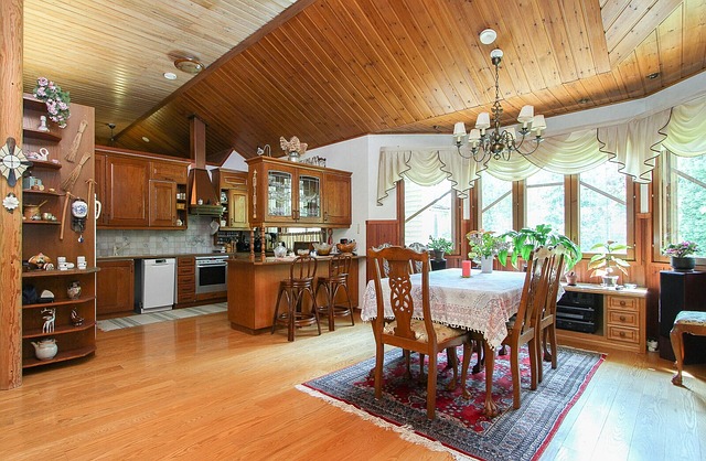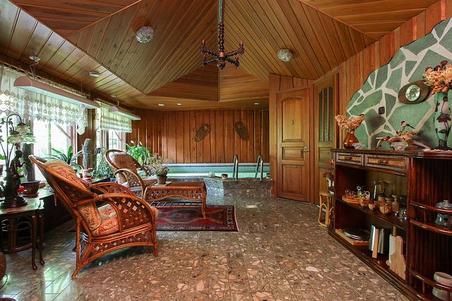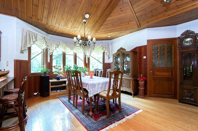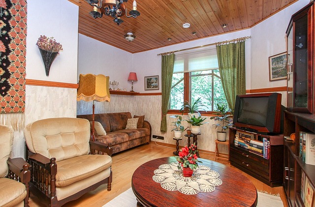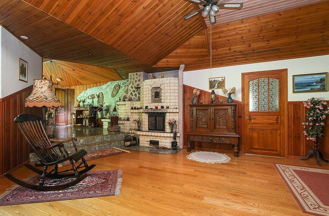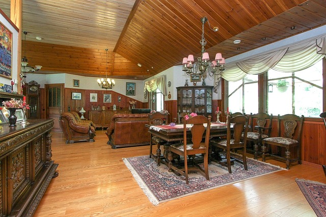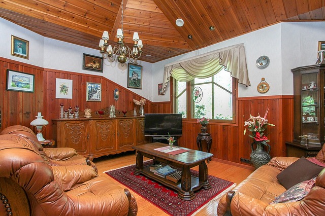 - Iso olohuone, korkea persoonallinen lautakuvioitu kattoa,