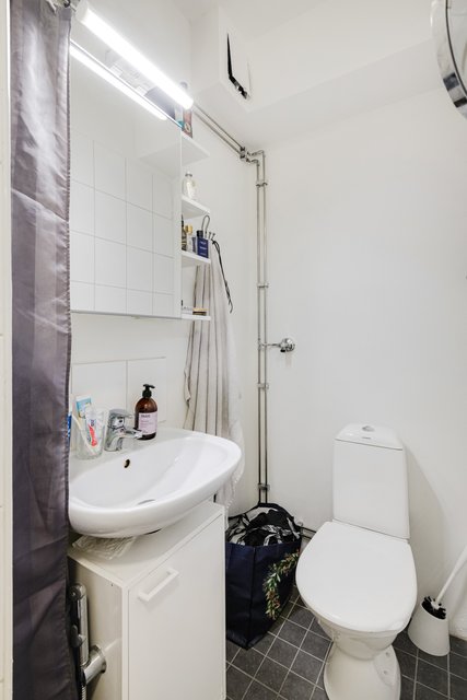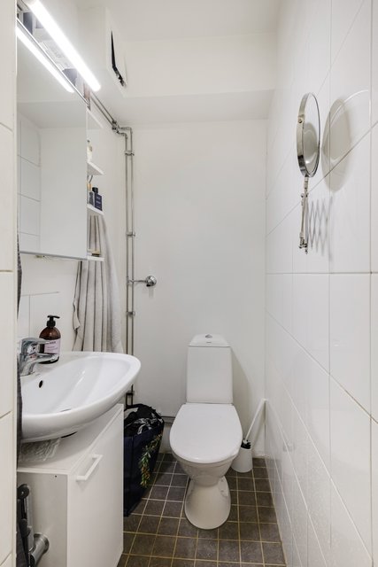 - WC-istuin, suihku, allaskaappi, bidee-suihku, peilikaappi, ja pesukoneliitäntä