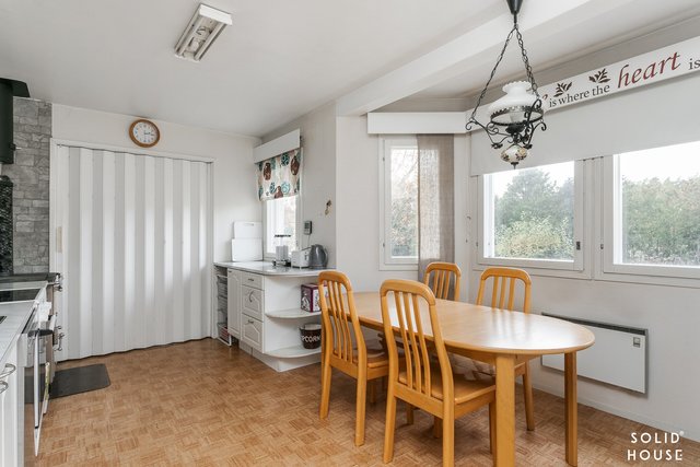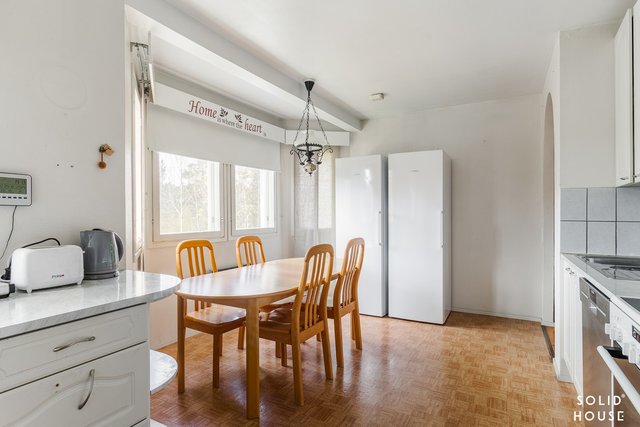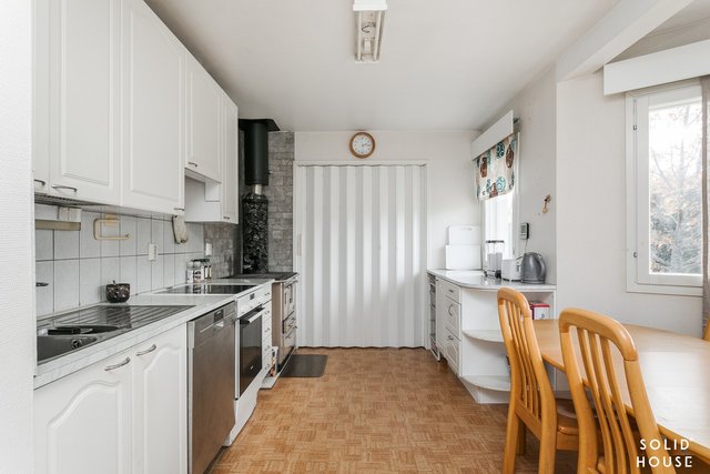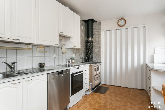 Kodin sydämessä avara ja valoisa keittiö, jossa mahtuu koko perhe kokkailemaan ja ruokailemaan yhdessä. Keittiön puuliesi lisää tilan kodikkuutta toki keraaminen liesikin löytyy.