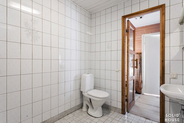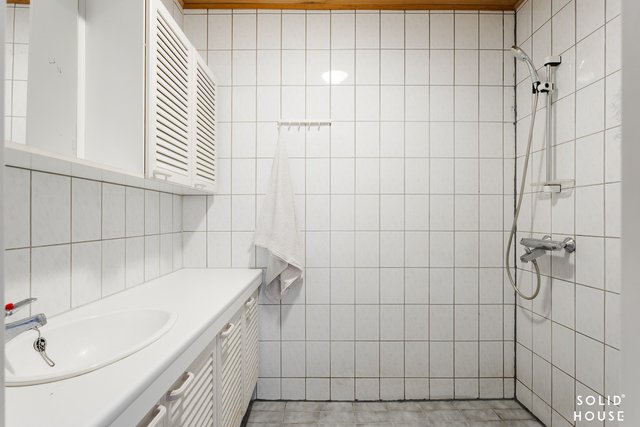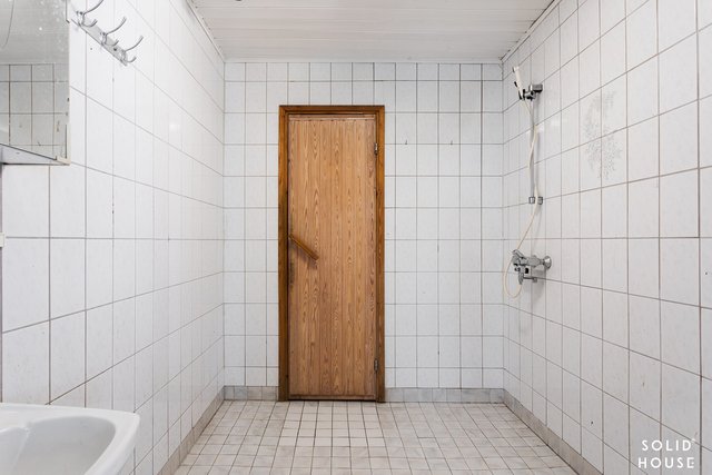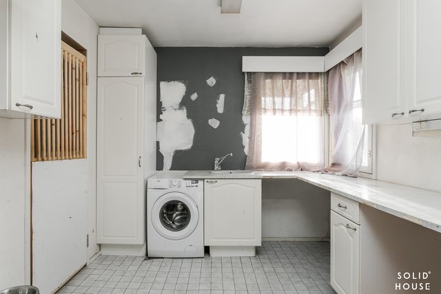 - Kaapistot, pesuallas, pesukoneliitäntä. Lattia muovimattoa, seinät lasikuitutapettia.
