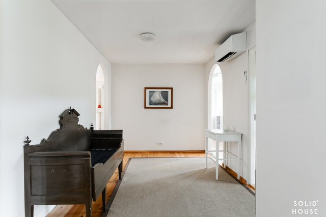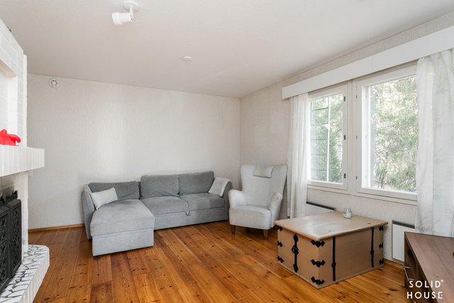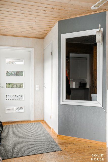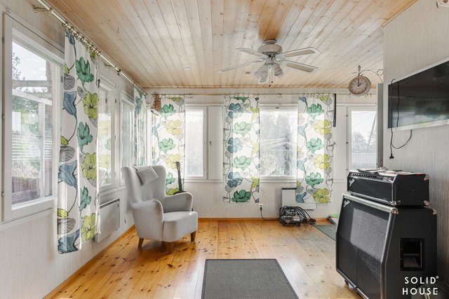- Kesähuone: lattia puuta, seinät tapettia ja maalattua pintaa.