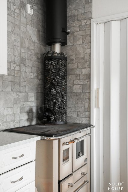 - Jääkaappi, pakastekaappi, keraaminen liesi, puuliesi, liesituuletin (suodatin) astianpesukone, pöytätasojen materiaali laminaatti. Lattia muovimatto, seinät lasikuitutapettia, keittiön välitilassa laattaa.