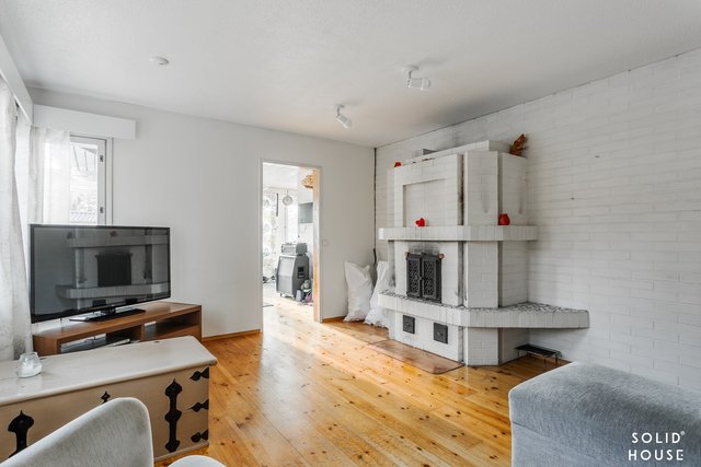 Olohuoneessa komea varaava takka, joka luo lämminhenkistä tunnelmaa ja lämpöä pimeisiin syysiltoihin.