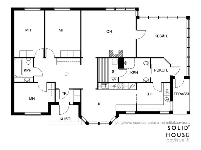 4h, k, khh, pesuhuone/ wc, s, kph/wc, et.aula, tk, Muita tiloja: kesähuone ja tekn.tila.