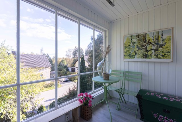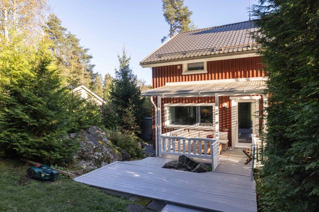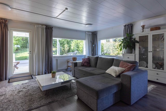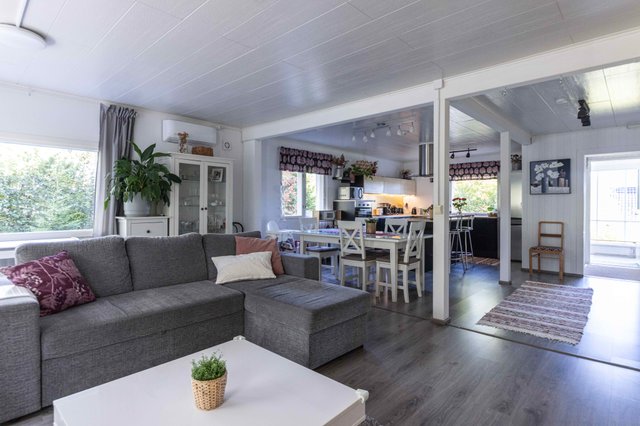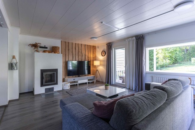 Asunnon sydän on avara olohuone, joka yhdistyy saumattomasti avokeittiöön ja ruokailutilaan. Varaava takka luo lämpöä ja tunnelmaa, ja olohuoneesta on suora pääsy katetulle terassille ja kauniille, suojaisalle pihalle jonka takasivu rajoittuu metsään. Etupihalla kasvaa kylän kaunein luumupuu, joka tuo keväisin upean kukkaloiston.