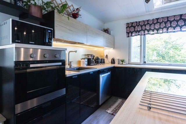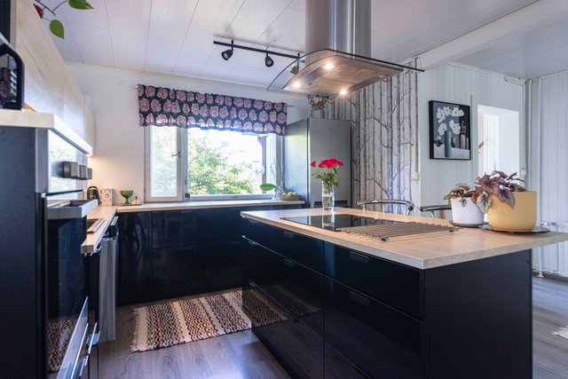 - Valoisa ja toimiva keittiö jossa runsaasti säilytystilaa. Saarekkeessa induktioliesi sekä liesituulettimen huuva.