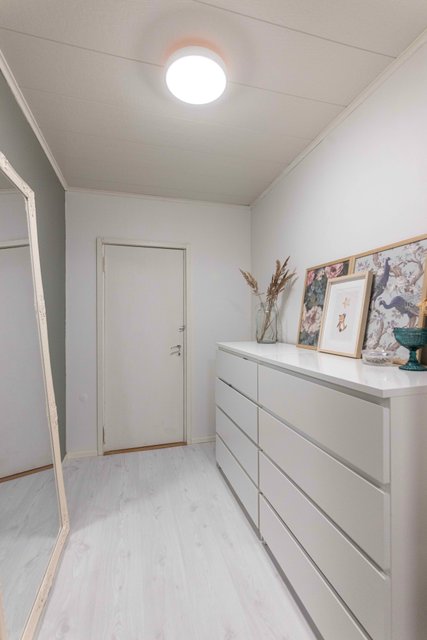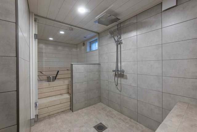 Kaksi tilavaa makuuhuonetta yläkerrassa tarjoavat rauhalliset puitteet levolle, ja tarvittaessa toisen makuuhuoneen voi helposti jakaa ja saada kolmas makuuhuone. Lisäksi yläkerrassa on kylpyhuone, jossa on suihku ja wc sekä vaatehuone ja varastotilaa. Alakerrassa sijaitsee moderni saunaosasto sekä käytännöllinen kodinhoitohuone ja iso oleskelutila. Kiinteistöllä on yhteisissä tiloissa puilla lämmitettävä sauna ja kylpyhuone.
