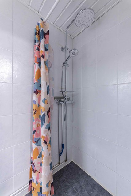 - Yläkerrassa kylpyhuoneessa suihku, wc, pesuallas sekä allaskaappi.