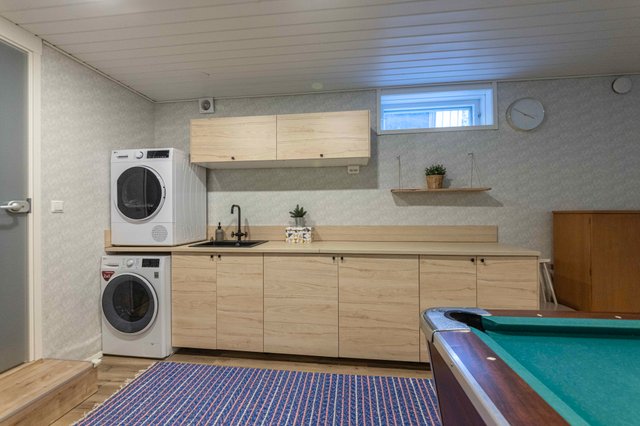 - Pesukoneliitäntä, pesuallas, pöytätaso, pyykkikaapit, ja tila pesutornille