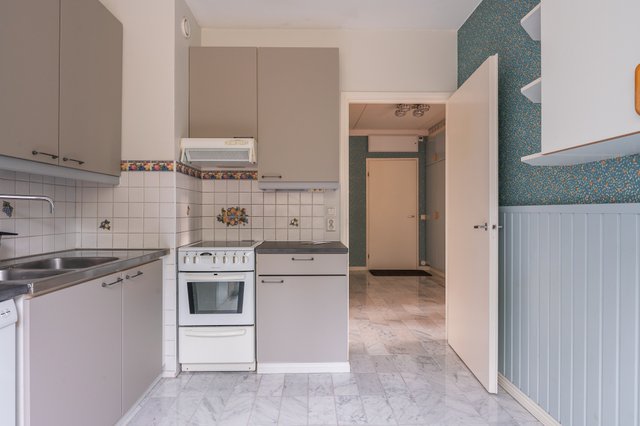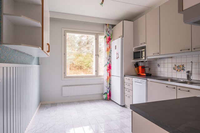 - Tilava keittiö, johon ruokapöytä mahtuu helposti. Kaappi- ja laskutilaa mukavasti. Keittiössä, kuten eteisessäkin, laattalattia.