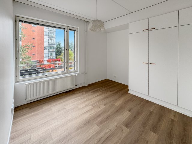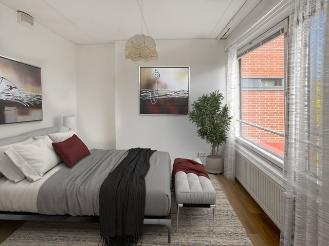 Tilavassa makuuhuoneessa on rauhallinen tunnelma, ja sen ikkunat avautuvat suojaisalle sisäpihalle. Keittiö on käytännöllinen ja hyvin varusteltu – kaappi- ja laskutilaa on runsaasti, ja ruokailuryhmälle löytyy oma paikkansa.