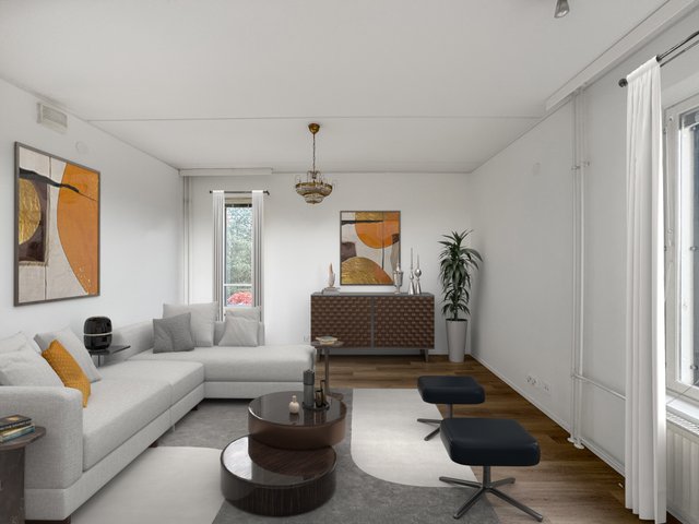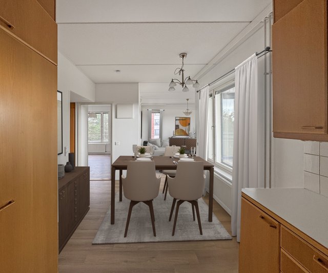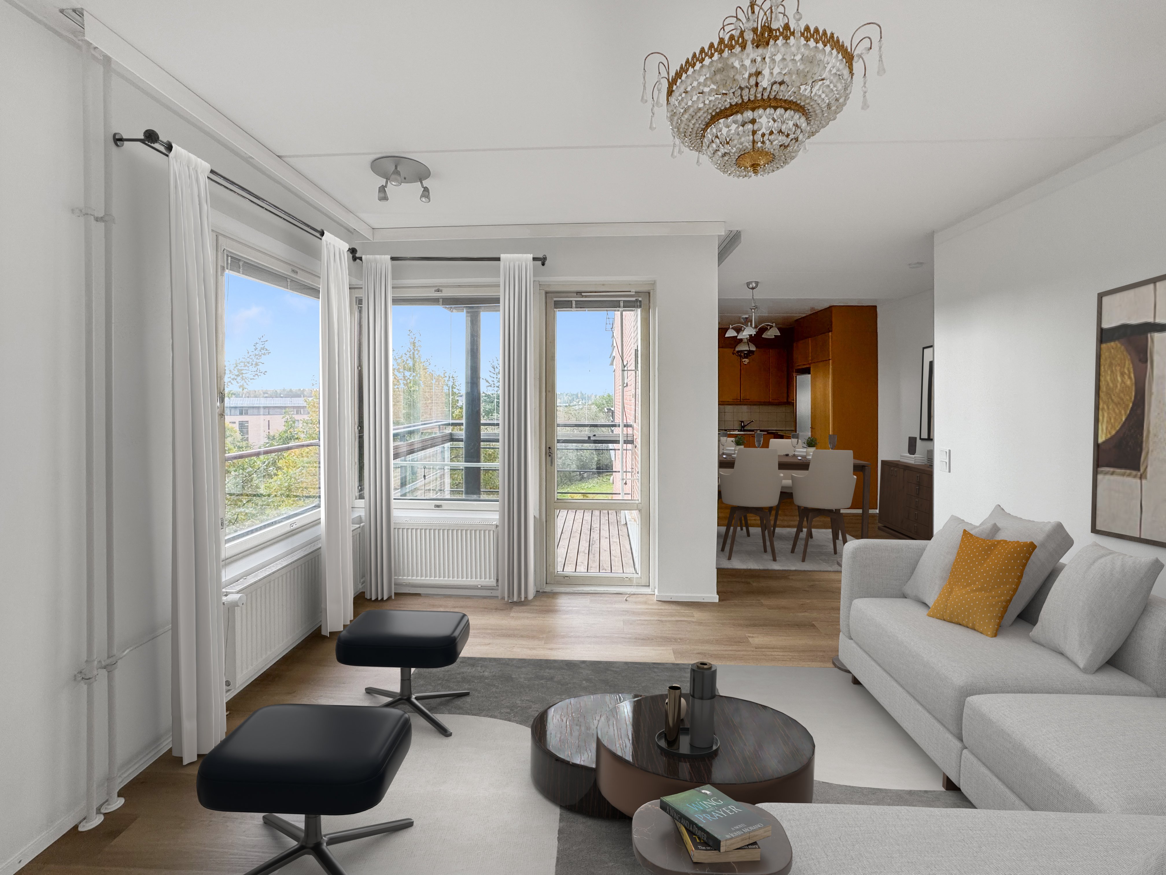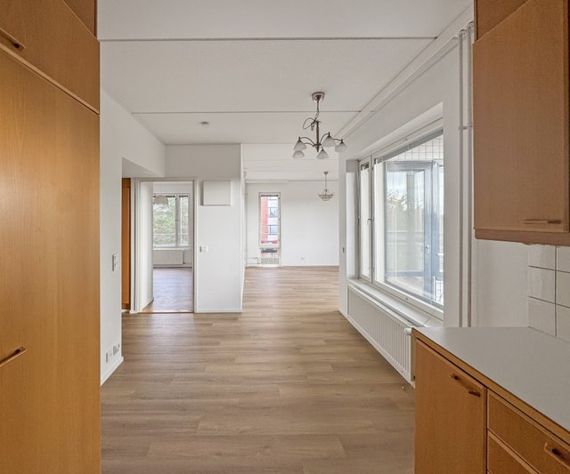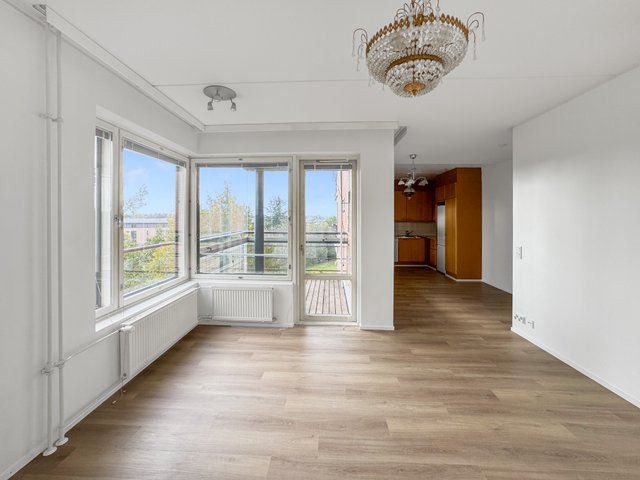 Avara olohuone yhdistyy saumattomasti keittiöön ja jatkuu lasitetulle parvekkeelle, joka tarjoaa viihtyisän lisätilan ympäri vuoden. Vuonna 2023 remontoitu kylpyhuone on moderni ja tyylikäs, ja sen yhteydessä on oma sauna – täydellinen paikka rentoutumiseen. Asumismukavuutta lisää erillinen eteinen sekä suuret ikkunat, jotka tuovat runsaasti luonnonvaloa vaaleisiin pintoihin.
