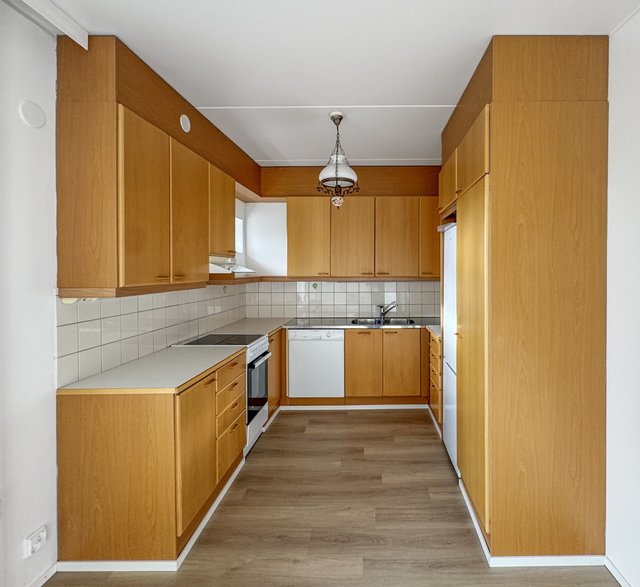 - Keittotilassa on runsaasti säilytys- ja laskutilaa. Keittiön varustuksiin kuuluu keraaminen liesi, liesituuletin, astianpesukone ja jääkaappipakastin. Työtasot ovat laminaattia ja lattia vinyyliä. Välitila on laatoitettu ja seinät maalatut.