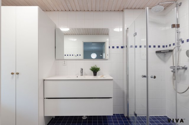 - Suihku, peili, allaskaappi, pesuallas, ja lattialämmitys