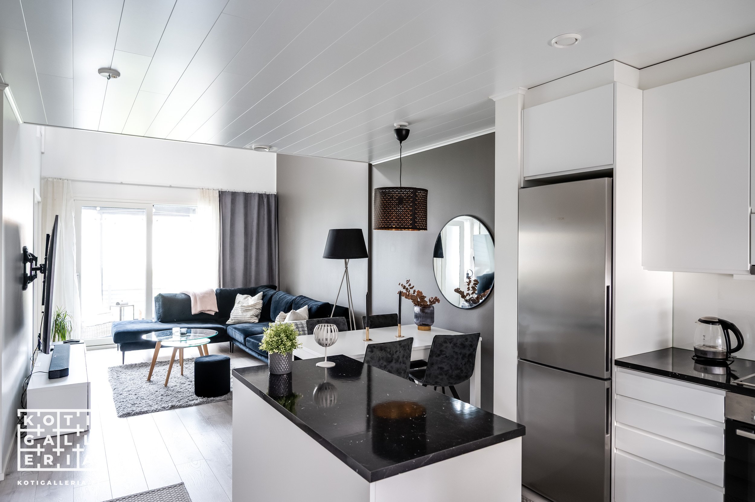 Keittiö on varusteltu laadukkaasti, ja sen saareke tarjoaa mukavasti työskentelytilaa. Keittiö ja olohuone yhdistyvät toisiinsa saumattomasti ja luovat todella kauniin ja harmonisen ilmeen, joka jatkuu läpi koko tämän kauniin kodin. Upea kylpyhuone tuo arkeenkin luksusta ja tyylikäs sauna kutsuu rentoutumaan.