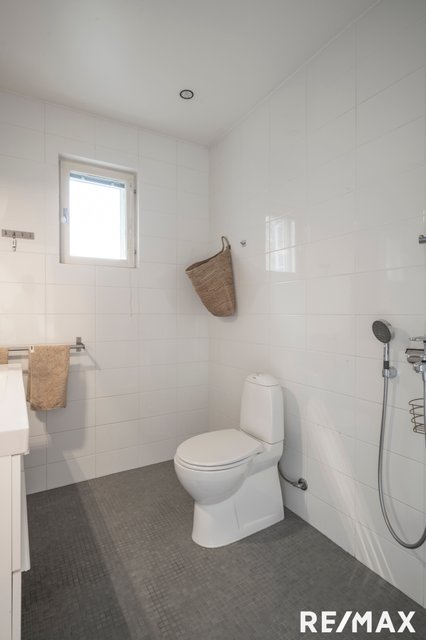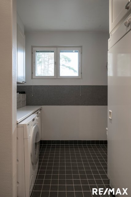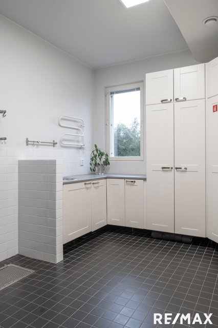 - Varsinainen erillinen, tilava kodinhoitohuone on alakerrassa, josta kulku suoraan ulos. Runsaasti kaappitilaa, allas, taso, kuraritilä suihkulla, lattia laattaa, seinät osittain laattaa ja maalattua lasikuitutapettia.