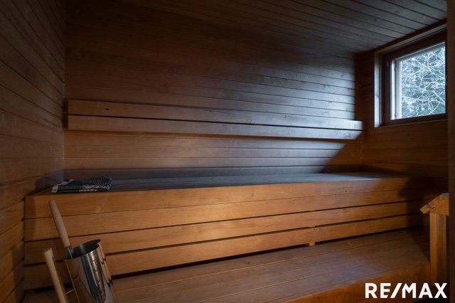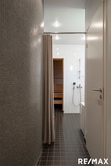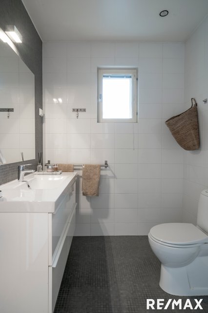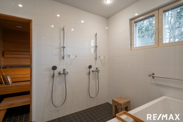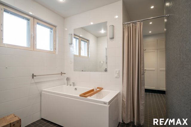 - Yläkerran makuuhuoneen yhteydessä ikkunallinen kylpyhuone, jossa peili, allas, allaslaatikosto, suihku, wc-istuin, seinät ja lattia laattaa. Yläkerrassa toinen kylpyhuone, jonka yhteydessä ikkunallinen kodinhoitotila, jossa kuivauskaappi, pyykinpesukone, kuivausrumpu, taso ja runsaasti kaappitilaa, lattia laattaa, seinät osittain laattaa ja maalattua lasikuitutapettia, lattialämmitys. Kylpyhuoneessa kylpyamme, 2x suihku, peili, lattia ja seinät laattaa, lattialämmitys, ikkuna.