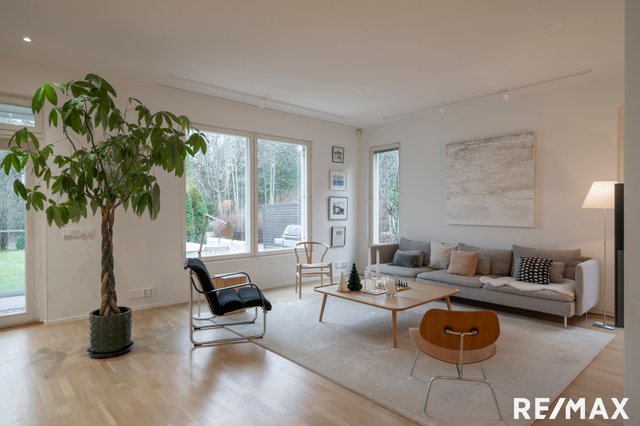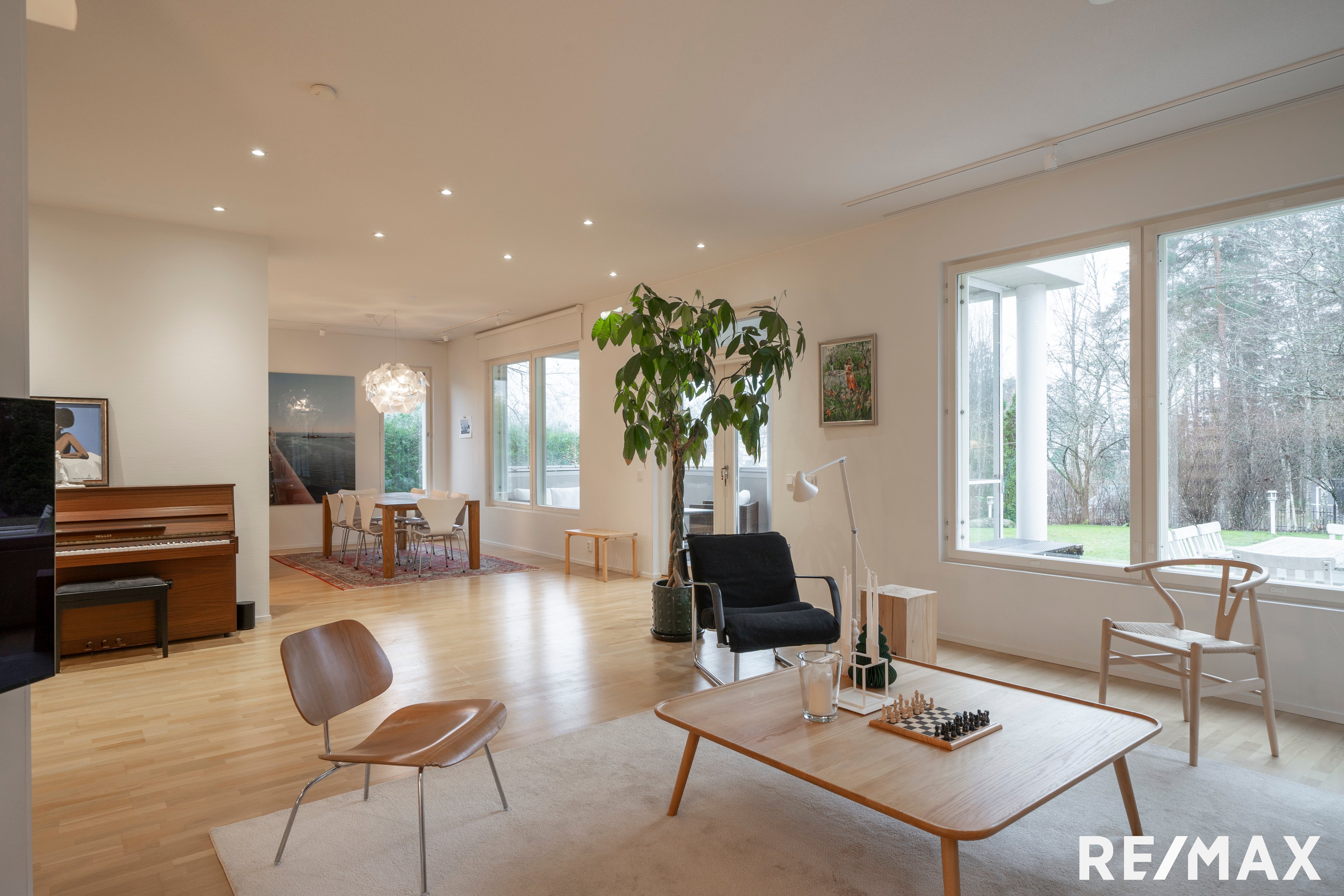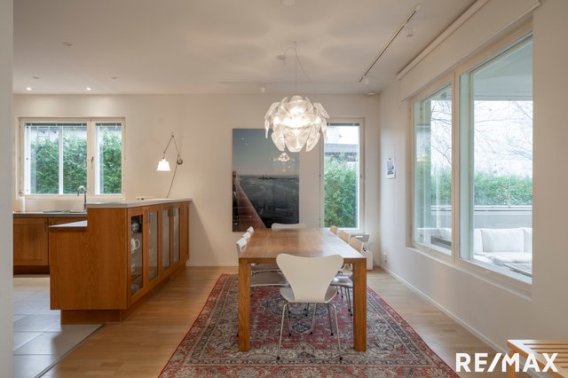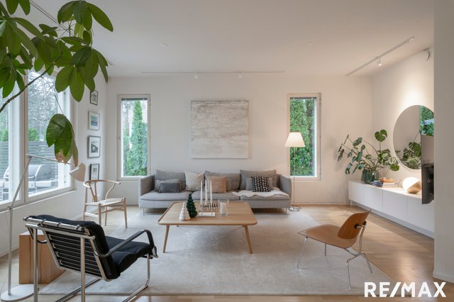 Alakerrassa tilava olohuone, kokkaajan unelmakeittiö sekä ruokailutila, johon mahtuu isompikin ruokapöytä. Olohuoneesta on käynti lasitetun terassin kautta puutarhamaiselle pihalle.