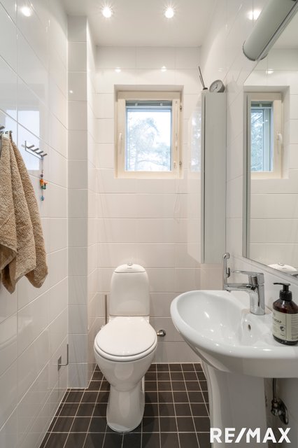 - Yläkerran kylpyhuoneen yhteydessä on erillinen wc: peili, allas, bideesuihku, wc-istuin, seinäkaappi, ikkuna, seinät ja lattia laattaa, lattialämmitys. Yläkerran yhden makuuhuoneen yhteydessä olevassa kylpyhuoneessa on wc-istuin. Toinen erillinen wc on alakerrassa: seinäkaappi, bideesuihku, wc-istuin, peili, allas, ikkuna, seinät ja lattia laattaa, lattialämmitys.