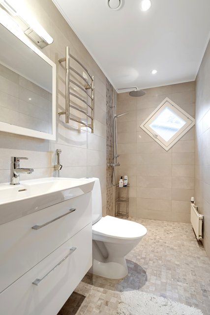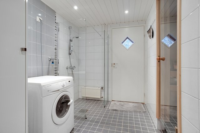 - Suihku, suihkuseinä, pesukoneliitäntä, ja lattialämmitys
