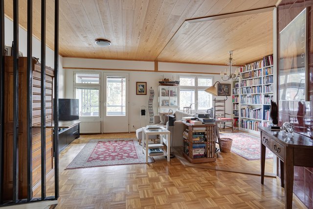 - Arkiolohuone yläkerrassa: seinät maalattu/laatta, lattia:parkettia